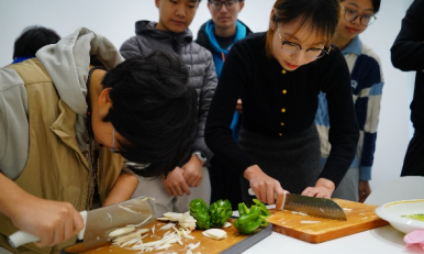 同学们在共享厨房体验烹饪乐趣