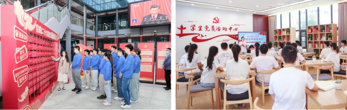 学校深入实施“新时代党旗领航工程”,围绕“早日站在党旗下”“党旗在我心中”“我为党旗添光彩”三阶段,建立系统的“一站式”学生社区党建体系,压紧压实社区党组织主体责任,抓实抓细党员教育管理常态化机制。一是让党的组织进社区。加强党支部、团支部、班委会和宿舍的协同联动,建设“纵横结合,协同共建”的社区党建工作体系,分层分类探索功能型党组织和社区实体党支部建设,通过党员责任田、党员先锋岗和党员寝室,完善社区党组织网格体系,形成“院系+楼栋”“功能型+实体型”党组织社区全覆盖工作体系。二是让党的声音进社区。校党委书记、校长带头走进社区讲授党课、思政课,组织学生红色理论学讲团、退伍大学生“家国情怀”宣讲团等开展专题巡讲,组织读书会、微党课等活动,教育引导广大学生立报国强国大志向、做挺膺担当奋斗者。三是让党的活力进社区。选树班团组织典型,持续开展荣誉班级争创工作。实施“筑梦启航”一年级学生主题教育计划,分阶段引导新生扣好“人生第一粒扣子”。开展“星火计划”“头雁领航”学生骨干培训班,组织“党员进寝室”“党员1+1”结对帮扶等实践项目,切实发挥学生党员的先锋模范作用。